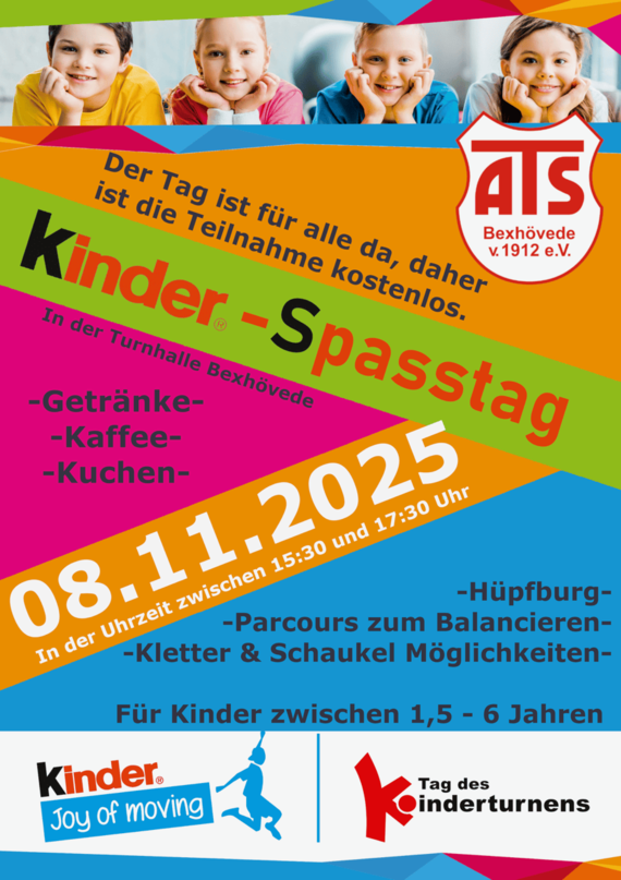 Am Samstag, den 08. November 2025, wird die Turnhalle in Bexhövede zu einem großen Abenteuerspielplatz! Der ATS Bexhövede lädt alle kleinen Wirbelwinde zwischen 1,5 und 6 Jahren zu einem ganz besonderen Tag ein – voller Lachen, Toben und fröhlicher Bewegung!
